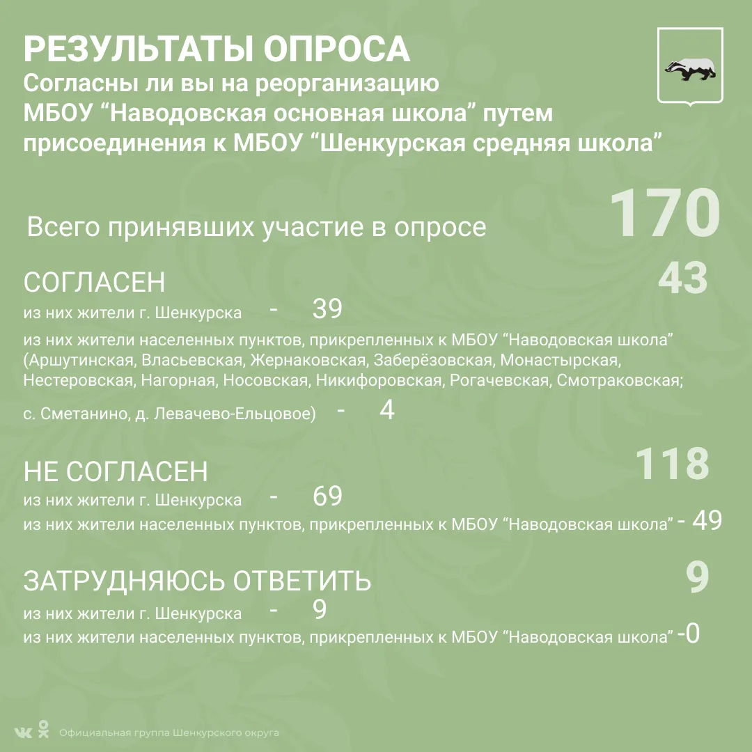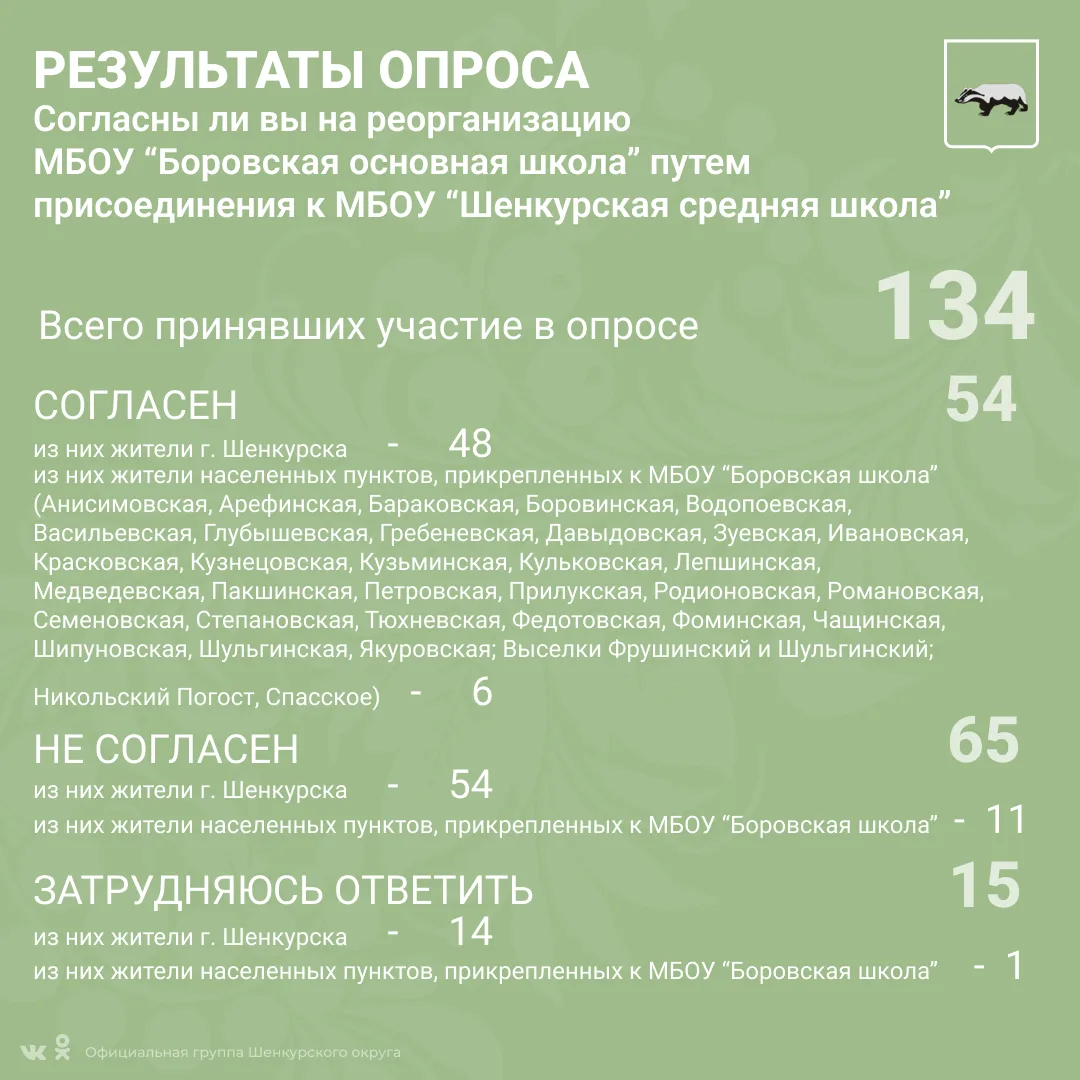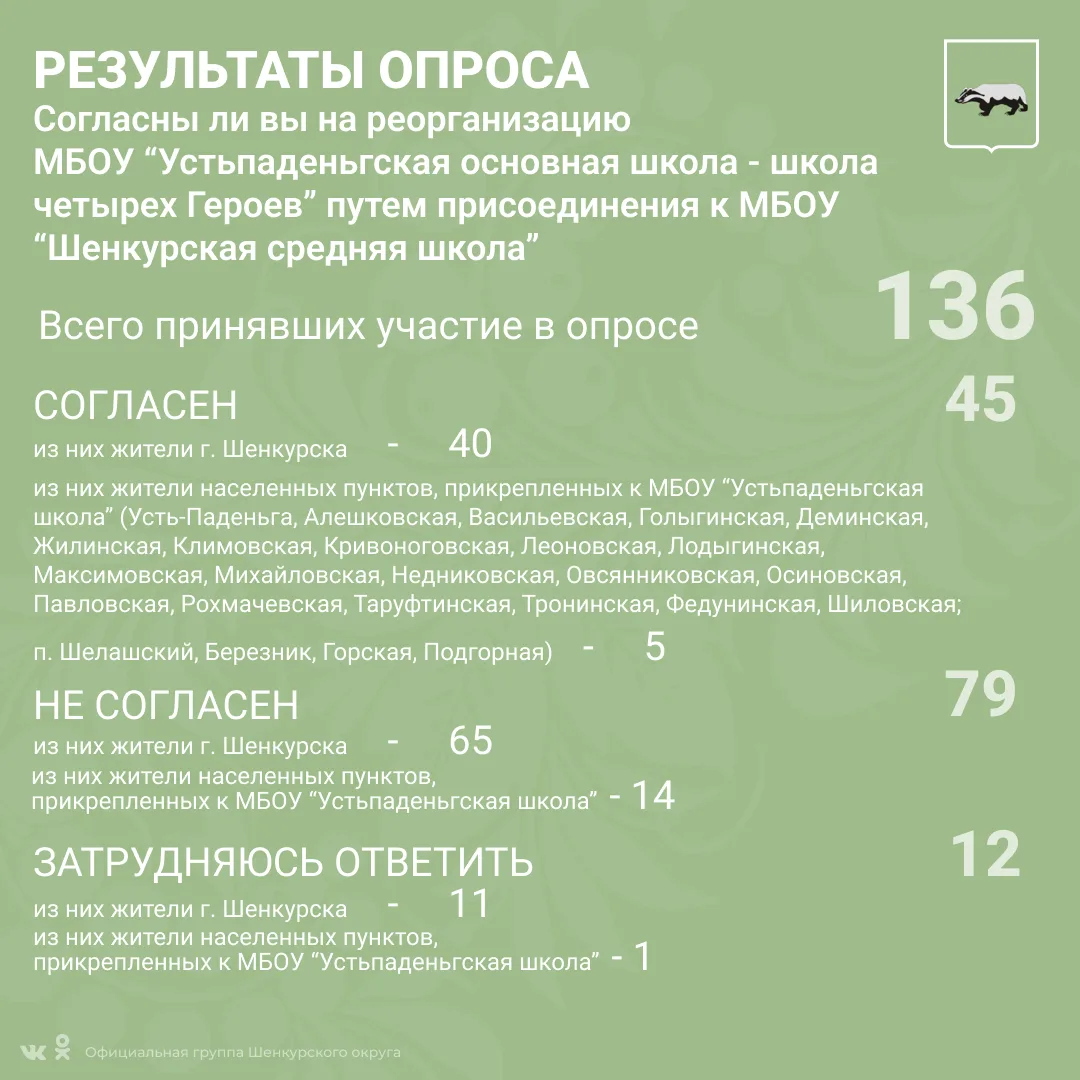 В соответствии с решением Собрания депутатов Шенкурского муниципального округа номер 355 , 356 , 357 от 20 февраля 2026 года в период с 9 по 15 марта 2026 года был проведен опрос граждан по вопросам реорганизации муниципальных бюджетных общеобразовательных учреждений "Боровская основная школа", "Наводовская основная школа", " Устьпаденьгская основная школа - школа четырех Героев" путем их присоединения к МБОУ "Шенкурская средняя школа".